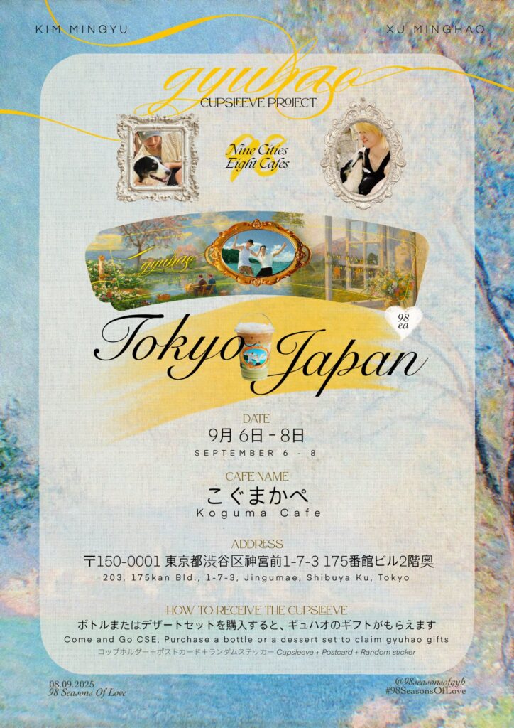 ✨ #98SeasonsOfLove ✨ 🖤 Project for GYUHAO DAY 💚 📅 Sept 6–8 ☕️ @kogumacafe7 Takeshita Street branch 📍 https://maps.app.goo.gl/qG7eiAUZ8Wn7LV9a6 #gyuhao #奎八 #규잇 #ギュハオ -